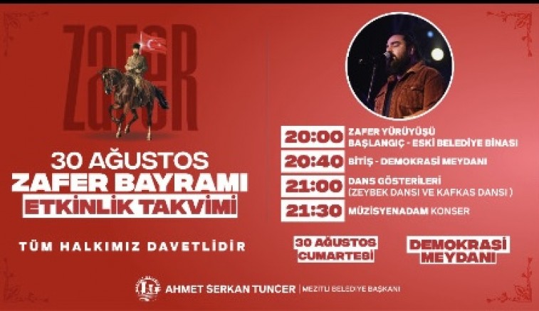 Mezitli Belediye Başkanı Ahmet Serkan Tuncer, tüm vatandaşları Zafer Bayramı coşkusunu birlikte yaşamaya davet ederek, “30 Ağustos, milletimizin bağımsızlık yolundaki en büyük zaferlerinden biridir. Bu anlamlı günü hep birlikte, büyük bir coşku ve birliktelikle kutlamak için tüm hemşehrilerimizi etkinliklerimize bekliyoruz.” dedi.