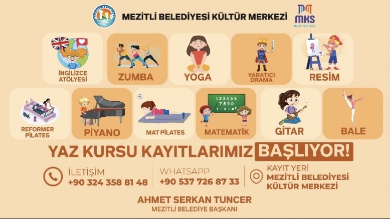 Mezitli Belediyesi, yaz mevsimine özel olarak hazırladığı kapsamlı yaz kurslarıyla bu yıl da kültürden sanata, spordan akademik gelişime kadar geniş bir yelpazede kursları Mezitli halkıyla buluşturuyor. Mezitli Kültür Merkezi başta olmak üzere belediyeye bağlı tüm sanat ve kültür birimlerinde Bale Okulu’ndan Gençlik Merkezi’ne, Kültür Merkezleri’nden çeşitli mahalle atölyelerine kadar düzenlenecek kurslar, özellikle çocuklar ve gençlerin kendilerini keşfetmelerine ve çok yönlü gelişimlerine olanak tanıyor.