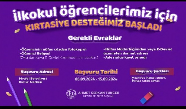 Mezitli Belediyesi, sosyal belediyecilik ilkesi çerçevesinde öğrencilere yönelik önemli bir destek projesine imza atıyor. 2024-2025 eğitim öğretim yılının yaklaşmasıyla birlikte, ihtiyaç sahibi öğrencilere kırtasiye yardımı sağlamak amacıyla başlatılan başvuru süreci 15 Eylül’e kadar sürecek. Mezitli Belediye Başkanı Ahmet Serkan Tuncer, “Mezitli Belediyesi olarak her zaman eğitimi desteklemeye devam edeceğiz” dedi.”